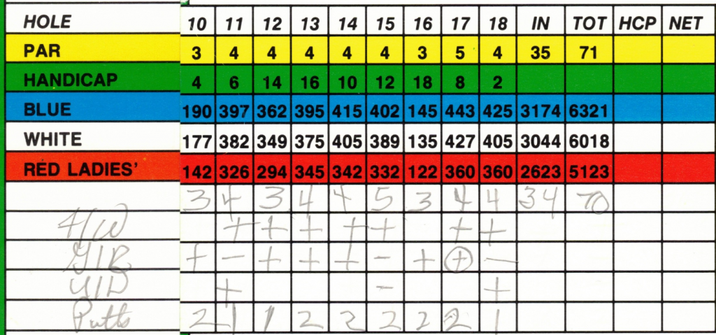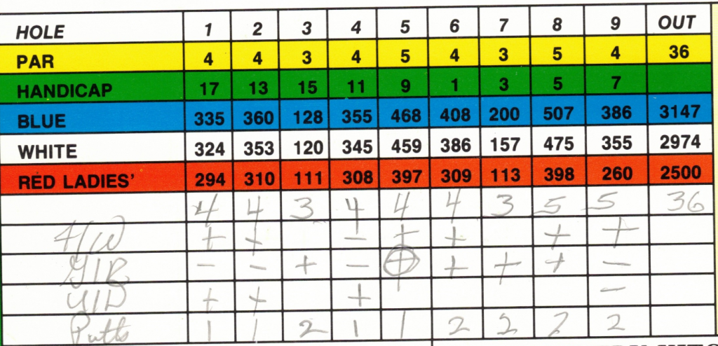 - On each hole you would have either a GIR or an U/D. If it was a GIR then a “+” was marked or if you missed the green then a “+” was marked in the U/D line or if you were unsuccessful in saving par from off the green, a “-” was added, or if it took more than one shot to get on the green, additional “-” were stacked on top of each other to indicated how many it took to reach the green after the normal “GIR” strokes for a hole.